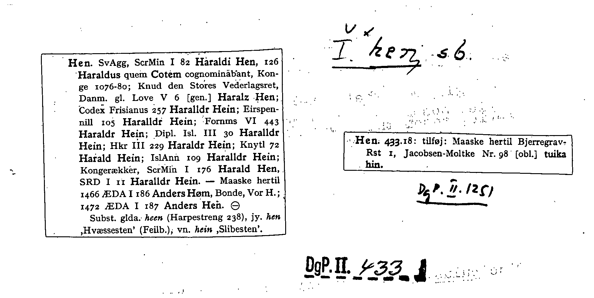 Hein; Hkr III 229 Haraldr Hein; Knytl 72 Hen. 433.18: tilføj: Maaske hertil Bjerregrav-